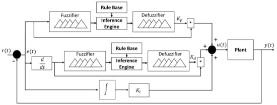 The PID controller is commonly used in several industrial processes and it is presented in Equation (17). A big disadvantage of this algorithms consist in the computing of the controller gains [,]. Figure 3 depicts the methodology proposed to compute the PID controller gains while using a fuzzy logic system. It basically consists of measuring the error, which is presented as a crisp value, and fuzzifier in order to inferred the  value and then multiplied by the error signal. The same procedure is applied to the . The change of rate in error is the input to the fuzzifier selected to compute . Variables  and  offer a fast response to the plant, the term  is constant, since it is only required to reduce the error to zero when the steady state is reached.