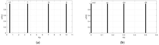 Once the values of the relations are founded, Equation (18) is used to transform the fuzzy set into the crisp value of the control gains. One can see in Figure 3 that  and  values are independently obtained.
