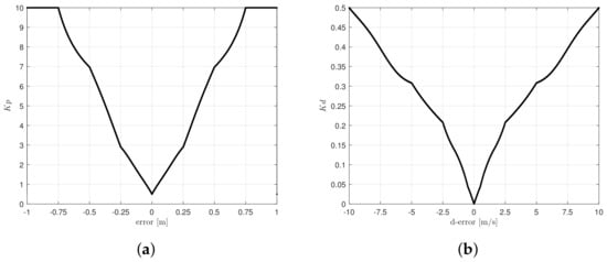 The controller gains tend to vary according to the error measure and rate of change of error. The variation when the controller follows as the trajectory oscillates from 3 to 6.5 in magnitude for  and from 0 to 0.052 for . Notice in Figure 14 that the controller gains do not have units.
