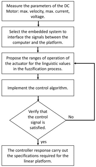 The Figure 7 shows the steps to implement the control algorithm based on user experience. The first step consist of recognizing the parameters of the motor as the maximum voltage, current, torque, and velocity. In some cases, these parameters are not available; when this happens, experimentation is required to detect the values to start the system design []. When the variables needed to system design are known, the next step is to select the embedded system to interface the computer, where is the control algorithm be implemented, and the electronic platform.