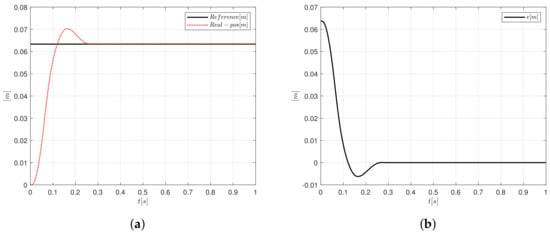 A step input signal of magnitude 0.064 m, this value is proposed, since the maximum voltage of the motor does not be exceed when the algorithm is running, is applied to the system to prove the controller performance when it is applied to the plant. Furthermore, an integral constant  is used for the step input signal. Regularly, this type of test signals are the most used to test the response of the controllers to sudden changes in the reference signal, giving a general overview of what would happen whether a load is added to the plant. If the controller, which is faced with an aggressive test input, is not well tuned, the control response would fall into a zone of instability, which could cause permanent damage to the mechanical and electrical structure. In Figure 9a, it can be observed that the controller presents a fast response, since the system reaches the steady state in 0.248 s and the overshoot is . Figure 9b shows the error signal and it tends to zero.