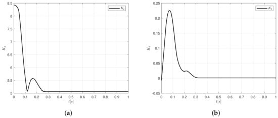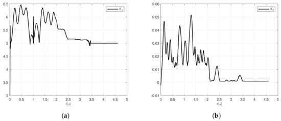 Figure 11a shows the behaviour of  gains for a step input signal. The maximum value obtained is  and is decreasing until it reaches a constant value . On the other hand,  reaches a maximum magnitude of , after that, it tends to converge to zero, since there is not variations in the shaft of the DC motor.
