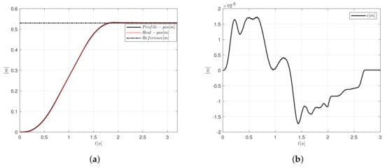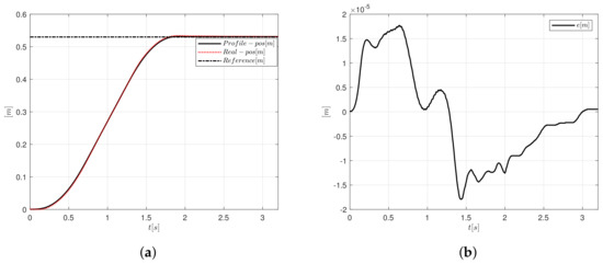 Figure 12a,b present the position and error signals, respectively. For Figure 12a, the position follows a reference to compare the desired trajectory against the system position. The amplitude error oscillates between  and  m. Note in Figure 12b that the error is zero at 2.65 s.
