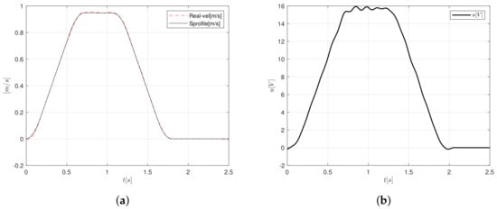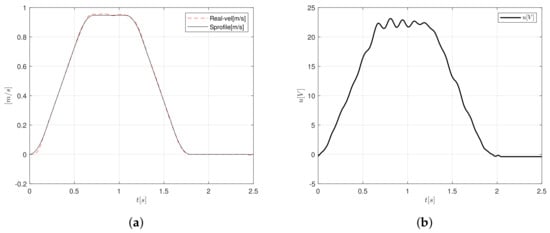 In Figure 13b, the control signal shows a maximum voltage peak of 16 V to achieve the desired position. The control signal is computed by the PID-like FLC relation of the controller gains. On the other hand, according to Figure 13a, one can observe that the velocity follows the reference properly, the maximum velocity computed by the trajectory algorithm is 0.94 m/s.