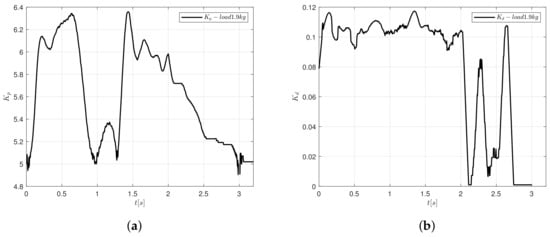Real-time response of the controller gains adding the cylindrical load of 1.9 kg (a)  and (b) .