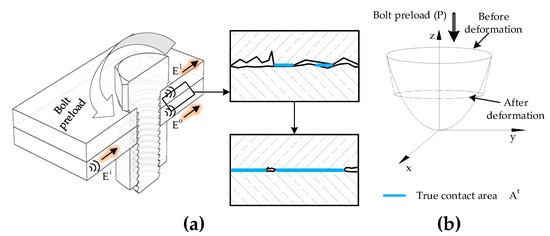 From a microscopic perspective, all machined surfaces are filled with a large number of asperities, and thus bolted joint surfaces can have partial contact with the underlying plate at their imperfect interface [48]. As illustrated in Figure 1a, if the preload of the bolt increases, the true contact pressure at the imperfect interface increases. However, it is understood that the actual contact area is less than the theoretical contact area [15]. Based on the models of the sinusoidal surface and the classic theory of Hertz contact [49], there exists a relationship between the true contact area and the pressure P (Figure 1b):