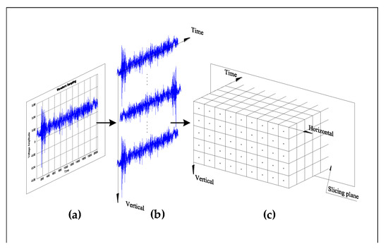 Process of ultrasonic wave propagation imaging (UWPI) system. (a) Measurement of time-domain response at each impinging point. (b) Placement of the measured signals at their corresponding laser impinging points that are outlined at the image processor. The result is a vertical plane containing all the impinging points and an into-the-page axis representing the time axis. (c) Slicing along the time axis of the 3D space.