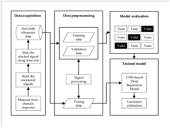 In this study, a DCNN was applied for a regression problem. First, given the target data pair with and , where is an input full-field ultrasonic data, is the corresponding torque value. The final goal was to estimate the unknown torque value for the new input wavefield data .