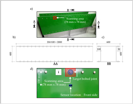 The 6061-aluminum box girder specimen: (a) front view with scanning area size, (b) AA cross-section, (c) BB cross-section, (d) sensor location setup. Here, i represents the bolt number being scanned, i = 1:25.
