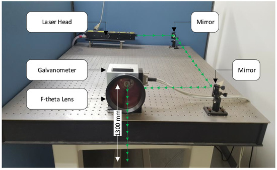 Figure 3 shows the UWPI system setup used in previous studies [32,36]. This system includes a Q-switched laser system, a galvanometer-based laser mirror scanner, an ultrasonic sensor, a high-speed digitalizer, and an image processor. This is a static setup system with a distance of 1300 mm from the target structure. In this study, the Q-switched Nd:YAG diode-pumped solid-state laser had a wavelength of 532 nm and a maximum frequency of 20 Hz pulse repetition. The galvanometer had a maximum rotation speed of 100 rad/s and an allowable scanning angle of rad. The maximum energy of each pulse was 55 mJ, the diameter of the laser beam was 0.45 nm, and the energy density was 4.15 mJ/mm2.