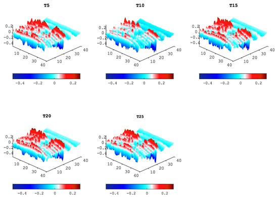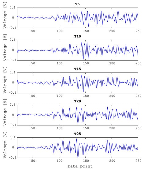 Figure 9 shows the typical wave forms of bolted joints, corresponding to a signal measured from five different torque values, 5 to 25 Nm in 5 Nm increments. To compare the differences between these cases, the sample signals are shown from the point at the top center of the scan area. Typically, the pulsed laser generates waves containing different frequency components, but as shown in Figure 9, the original signals already had a low noise level, and thus further processing was not required [33].