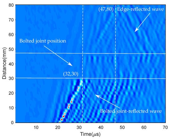 To this point, raw full-field ultrasonic data were created. After that, the temporal margin describing the effective looseness in the bolted joints was identified based on several methods presented in our previous research [45]. However, for simplicity of the proposed method, here the temporal margin described by the time–distance–wave amplitude graph was chosen. Another automatic approach was presented in [45]. From this typical sample shown in Figure 11, it can be observed that the time when the wave front with a significantly high energy reached the target bolt was 32 s, and the time when the wave reflection from the top edge emerged was around 47 s. From these results, the temporal period 32 to 47 s was utilized for the DCNN as the input data. In other words, 31 samples were extracted for each time experiment because the sampling frequency was sample/sec.