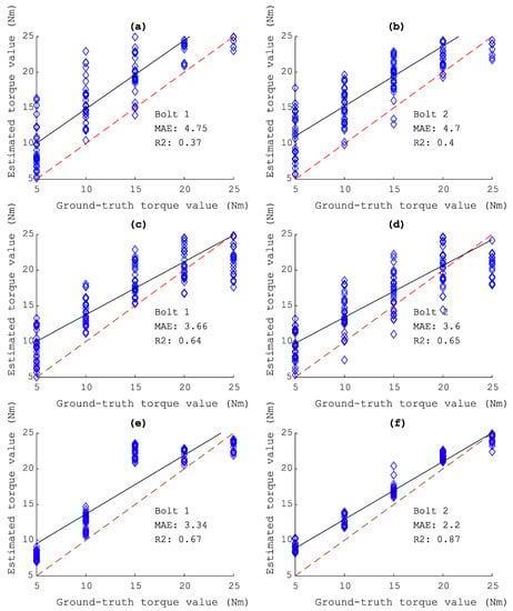 Although many academic works have explored different methods of detecting bolt loosening, including vibration-based measurements [2,3], electro-mechanical impedance methods [4,5,6,7,8], electrical conductivity techniques [9], ultrasonic-based measurements [10,11,12,13,14,15,16,17,18,19,20], and vision-based methods [21,22,23,24,25,26], much less research has been done on the applications of machine learning (ML) or deep learning (DL) algorithms in this field. Recently, ML and DL have become the breakthrough tools, particularly in the field of computer vision, to overcome the limitations of conventional structural health monitoring (SHM) and non-destructive evaluation (NDE). As introduced in a review study by Azimi et al. [27], ML and DL algorithms can be successfully applied to a wide range of applications in SHM, such as cracks, corrosion detection and structural component recognition [28,29]. Recent studies utilizing vision-based techniques with ML and DL algorithms for bolt looseness detection have been conducted [21,24,25,30]. These studies can be summarized as follows. In [21], the authors proposed a vision-based method incorporating images of bolted joints taken with a smartphone camera, and ML algorithms to detect the loosened bolts. Their approach was successful in detecting distinctively loosened bolts. In addition, using a similar approach as [21], in [24,25] the authors reported a DL algorithm approach with camera images to detect looseness in the bolt. However, with these techniques, the author can only detect whether the bolt is loose. Moreover, the level of looseness of the bolts was evident to the naked eye. These techniques cannot provide the torque value associated with the target bolt. In [30], the authors reported a new vision-based method for detecting the looseness of bolted joints in a flange connection. Nevertheless, the authors pointed out in the conclusion that the proposed method cannot quantify the level of the loosened bolts. From these state-of-the-art studies, the quantification problem in bolt looseness still remains a challenge and is an open field of research in terms of improvement. For this reason, our proposed method quantifies the looseness level with the aid of signals received from a laser ultrasonic system. Furthermore, our approach is based on a data-driven technique, i.e., a DL regression model with hundreds of thousands of trainable parameters, which can learn from thousands of samples and with the aid of a cross validation technique. These processes can overcome the limitations of conventional signal processing techniques, including the issues of noise cancellation and parameter sensitivity. Those methods mentioned above can be validated by observing how successful our trained model is, when tested on unseen testing data during the validation step.