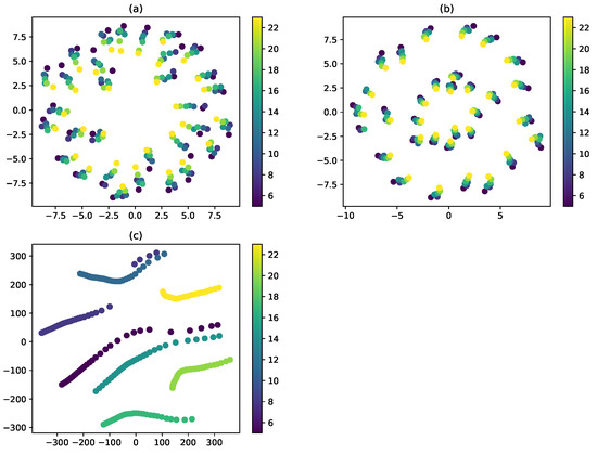 tSNE graph for seven different torque conditions on bolt 5 using different data sets. (a) D1, (b) D2, and (c) D4.