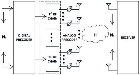 For capacity enhancement of upcoming 5G systems various physical layer [1,2,3,4,5] and network densification techniques [6,7,8,9] are investigated. The emergence of millimeter-wave (mmW) with massive multiple-input multiple-output (MIMO) is considered as a promising technique for the upcoming 5G/beyond 5G (B5G) wireless communication systems [10,11,12], as they can provide an increase in both the available bandwidth and the spectrum efficiency [13,14]. However, as per Friis Law, communication at such high frequencies results in high path loss, and therefore omni directional transmission is not feasible due to considerable coverage reduction. However, vice versa the short wavelength associated with mmW frequencies enables to constitute a massive MIMO architecture using a large antenna array [15,16]. A massive MIMO architecture can provide sufficient gains by using pre-coding and beam-forming techniques to encounter signal attenuation caused by mmW frequencies [17,18]. For pre-coding, three main architectures are considered for millimeter wave communications, i.e., (1) a fully digital pre-coder, (2) an analog architecture, and (3) a hybrid pre-coder.