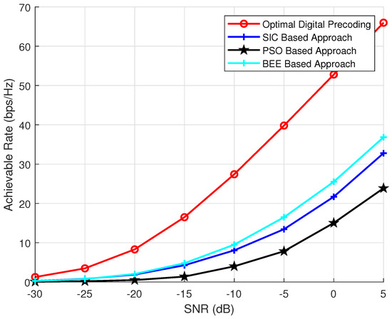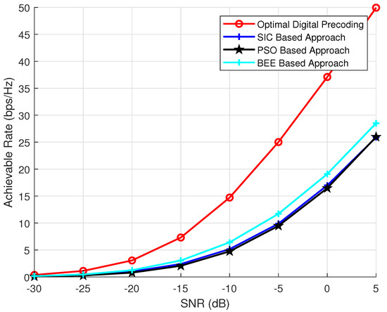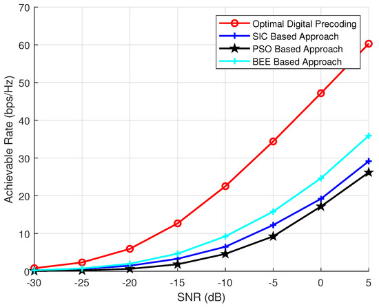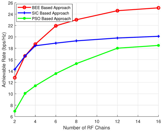 The effect of variable number of RF chains on the performance of algorithms is discussed in this section. is kept as 144, is kept as 36, the simulations are performed for variable number of RF chains ( = 3, 6 and 9). The results (Figure 6, Figure 7 and Figure 8) show that the proposed scheme outperforms SIC based and PSO based pre-coding irrespective of the number of RF chains. Moreover, the performance gap between the BEE algorithm and the SIC based algorithm increases with the number of RF chains. Figure 9 validates the performance superiority of the proposed algorithm when the RF chains increased.
