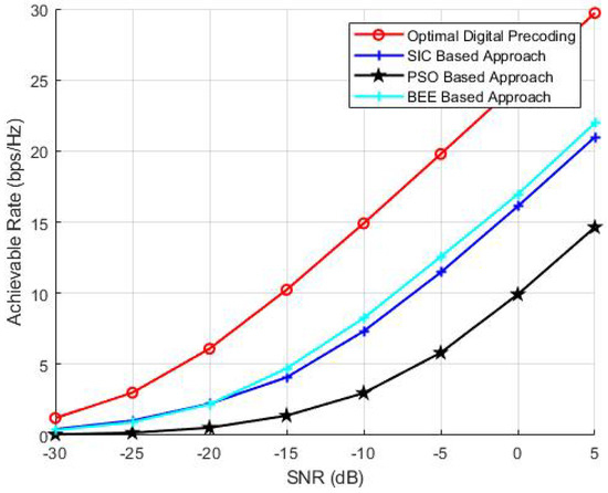 - We characterize the performance of pre-coding algorithms for different numbers of RF chains. It is shown that for a higher number of RF chains (where antennas per RF chain is reduced) BEE outperforms the SIC based technique for achievable rate, and the performance gap increases with the number of RF chains. Moreover, when the number of RF chains is less (where antennas per RF chains is high) the performance of the BEE algorithm is comparable to the SIC based approach for achievable rate. However, BEE outclasses all other evolutionary algorithms in every scenario.