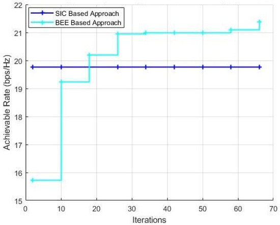Figure 10 and Figure 11 show the performance comparison with a variable number of iterations for BEE algorithm with the population kept as 70 and 20, respectively. It can be verified that when the population is kept as 70, the BEE based algorithm outclasses the SIC based algorithm within just 10 iterations of the algorithm. When the population is decreased to 20, the optimal number of iterations to outperform the SIC based algorithm is 20.