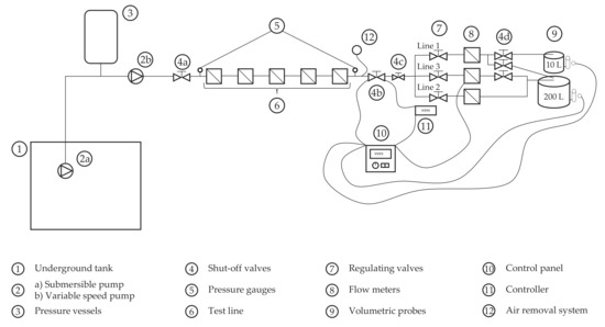 A simplified schematic of the first test bench is shown in Figure 1. Water is pumped from an underground tank using variable speed pumps. The stability of flow and pressure at the inlet of the bench is assured by means of a 1000 L pressure vessel. The bench can fit up to five DN15 water meters in series. Downstream the bench, there is a set of valves and flow meters that allow adjusting the flow rate of the test to the desired value. Two probes of 10 and 200 L are used as a reference volume. For the series of tests presented in this study, the 10 L probe was only used at low flows, i.e., 20 and 50 L/h. For the remaining tests, the 200 L probe was used in all cases. The errors of the meters were obtained by means of the standing start and stop test method (ISO 4064-2:2014 [19]). The scale division of the 10 and 200 L probes was 0.01 and 0.2 L, respectively, which represents 0.1% of the tested volume and is significantly smaller than the volume resolution that can be read from the meter.