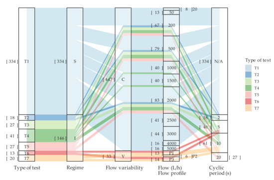The details of these tests, used as a reference, named T1, are shown in Figure 4. They were conducted under steady state conditions (regime: S), the flow rate through the meter was maintained constant (flow variability: C), and the flow rate ranged between 20 and 5000 L/h. Considering that the flow rate was kept constant during the test, the Cyclic Period parameter does not apply in this case (N/A). The numbers in brackets indicate the quantity of tests included in the group. In total, 334 tests were conducted on T1.