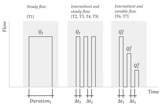 Domestic water demand is exceptionally heterogeneous, and flow rate and duration of water consumption events are extremely scattered [14,15,16,17,18]. From a duration perspective, a shower event is not comparable with shorter uses, like filling a glass of water. Additionally, the flow rate of a leak is much lower than the consumption flow occurring when several water appliances are used simultaneously. Each water end-use has its own independent characteristics, which make the modelling of residential water demands a complex topic. However, some authors have proposed a simplification of all this casuistic by modelling water consumption events as a series of pulses of a given duration and a flow rate that are distributed through time, both of these parameters (duration and flow rate) being described by probabilistic functions that can be specific to a water end-use and individual user [15,27,28,29,30,31,32]. Therefore, from a standardization point of view, employing complex consumption profiles to conduct the tests is not an option, as the purpose of this experiment is to design and conduct a test programme that provides repeatable results and can be reproduced by an independent third party. The test programme used intended to limit the intermittency and variability of flow. In the case of flow intermittency, the cyclic periodicity of the consumption pulses was set to 2, 5, 10, and 20 s. In the case of flow rate, and provided that the typical consumption flow of a domestic appliance is between 200 and 2000 L/h, the test flow rates were primarily chosen in this interval.