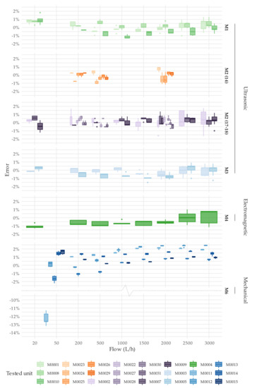 As expected, the error curve of solid-state water meters is relatively more uniform (flat) compared to the error curve of a single-jet mechanical water meter, which suffers from more oscillations throughout the measuring range. Figure 9 shows by means of a box-whisker plot, the error distribution at different flow rates of all units tested. Figure 9 does not include the results from tests at 50 L/h of the unit M0011 (M6 meter type) and at 5000 L/h of the units M0016 and M0017 (M7 meter type), with an associated error that exceeded ±2.5% of the reference volume, in order not to bias the results. An assessment of the variability of the error through the measuring range can be easily analyzed by the interquartile range amplitude of the box-whisker diagram.