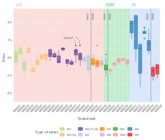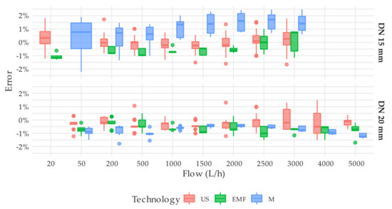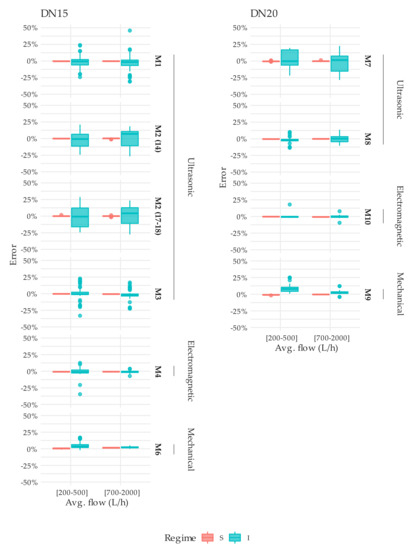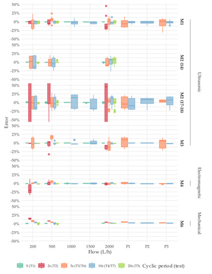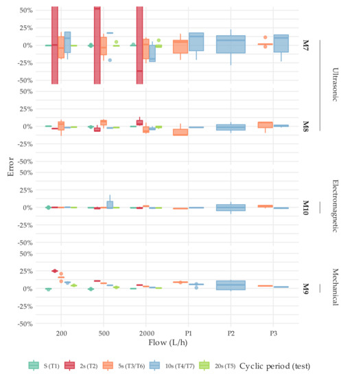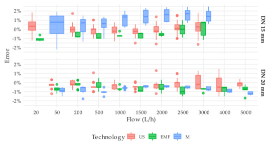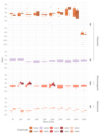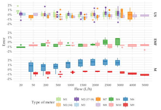 Figure 11 presents the consolidated variability of the errors obtained by technology and the flow rate. As expected, ultrasonic meters showed a uniform behavior throughout the measuring range, and the average error at each flow rate slightly oscillates around the average value. The error distribution of the electromagnetic meters, M4, and M10 types show a difference in behavior between the two, which essentially are the same meter of different diameters.