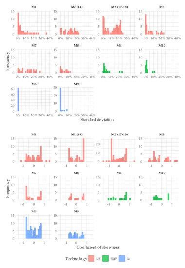 Figure 14 allows for a comparison between technologies in terms of repeatability and error bias, where the standard desviation and coefficient of skewness corresponding to error distribution under intermittent flow conditions are represented through histograms. It can be observed that errors of ultrasonic meters are more dispersed than for the electromagnetic units tested, especially meters belonging to M2 type. In turn, mechanical meters are by far the ones presenting the best repeatability, with the standard deviation that, in most cases, is less than 1%. Regarding the coefficient of skewness, it is symmetrically distributed around the zero value. Thus, the error distribution associated with a meter tested according to a type of test and a given flow or flow profile could show a positive skewness (i.e., the mean is greater than the median). However, the error distribution associated with another meter of the same type or even the same meter subject to another type of test could show a negative skewness. Therefore, this evidence that the internal algorithms of the static meters tested do not intentionally exploit the errors in any direction or cause a clear bias in the errors distribution.