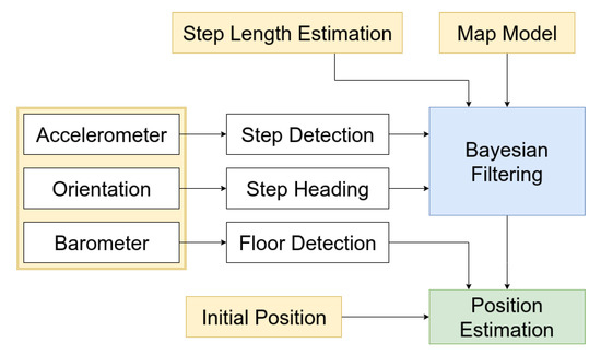 The dead reckoning approach computes a current user or device position from the previously estimated position. Considering pedestrians, it is called pedestrian dead reckoning (PDR). Bayes filters probabilistically estimate a state of a dynamic system using noisy measurements obtained up to the current time of the estimation [23]. The Bayesian approach has found numerous applications in various fields. In [24], a list of selected domains is proposed including, but not limited to, target tracking, computer vision, robotics, speech enhancement and recognition, machine learning, financial and time series analysis, and fault diagnosis. The Bayesian filtering and the PDR are two core components of the proposed system. The PDR approach estimates a new user location and the Bayes filtering technique incorporates the map model and deals with the uncertainty caused by noisy measurements and inaccuracies introduced by PDR, e.g., inaccurate step length estimation.