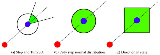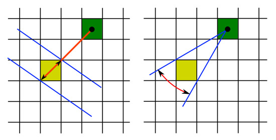 In Equation (12), the belief value is calculated using a convolution. Convolution masks depend on transition and noise models and define how the probabilities are redistributed during the prediction stage. Moreover, it is possible to precompute the masks for selected values of the direction and the step length to reduce the computational demands during the state estimation. Convolution masks are typically smaller than the entire grid since the transition probability for all pairs of points with the distance greater than a single step length plus the maximal noise value. Equation (12) expresses the method that for every point in the posterior grid, the weight is calculated from the set of points in the prior grid according to the mask. The reverse process may be beneficial for the implementation, where the prior grid points are iterated in a loop instead of the posterior grid points. It allows to omit the convolution execution for points with zero or negligible weights. In the implementation, the evaluation (Equation (13)) is performed during the convolution, enabling to improve the usage of the map model. Therefore, the accessibility of a grid cell is not determined only by its position, but also as an accessibility of the transition, i.e., a grid cell T is accessible from a grid cell S if all cells composing the path from S to T are accessible. The path is constructed using a line drawing algorithm and precomputed for relative positions of any two grid cells in the mask. Moreover, different grid structures were investigated in the referenced previous work, i.e., the regular square grid and the hexagonal grid consisting of regular hexagons, where the distance between centers of two adjacent grid cells is the same in all six directions.