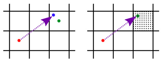 Purple arrow represents the step from the red point. Left figure shows that in the grid filter, the next position is estimated at the green point in the grid cell center point instead of the true location denoted by the blue point. In the centroid grid filter (figure on the right), the next position is chosen from the set of fine grid points.
