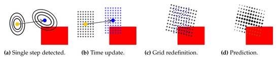 Figure 4 visualizes a computation of a posterior state. The grid is transformed to the grid and redefined to the posterior grid . The time update stage relocates all points from the prior grid according to the PDR, the measured step heading, and the estimated step length. The posterior grid is further redefined. Moreover, the process includes a calculation of the grid size and the point density in the grid. In the prediction phase, new values for the belief set are computed, based on the prior grid and the map model or measurements in general.