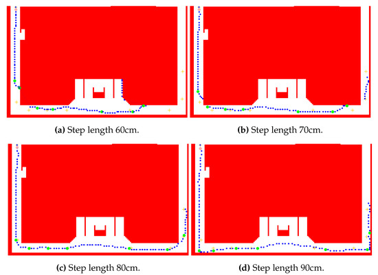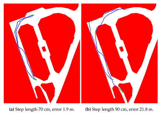 To reduce the computational demands on the convolution, the masks are precomputed for selected step lengths and directions. The real values from sensors are rounded and the corresponding mask is applied on the filtering. The weight calculation (Equation (15)) is not performed for all coarse grid cells. Active coarse grid cells with positive weight values in are iterated, and reachable cells in , which are not yet computed, are considered as target cells t. Another technique to improve the speed of the posterior state computation is resetting the negligible values. Values lower than a selected threshold are set to 0 in the correction phase before all weights are normalized. A less efficient but more stable method keeps a predefined maximum number of active grid cells. Therefore, weights for all cells, sorted by belief values, extending the limit are set to 0. The drawback of such methods is that in some scenarios, especially with incorrect step length estimations, the knowledge of a position may be lost and a recovery method must be implemented based on the history of estimations or other inputs to avoid the uniform distribution of the probability over the entire map as discussed in the evaluation.
