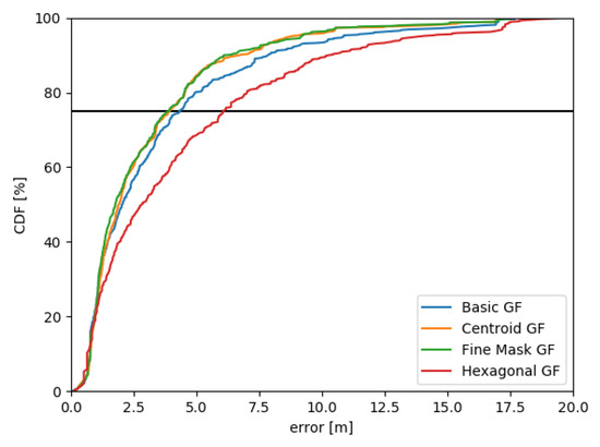 Considering the last evaluation experiment on the IPIN 2018 on-site track, five performances obtained third quartile of the error below 6 m out of 773 runs (2× hexagonal GF, 3× centroid GF). The average of the third quartiles for all used configurations are 27 m for fine mask GF, 26 m centroid GF, 31 m basic GF, and 35 m hexagonal GF which supports the previous observations (Figure 8). The particle filter reached 39 m and the APM 12 m (less configurations with underestimated step lengths were used for these two methods). Considering validation datasets results, tendencies for all methods are observable, e.g., greater errors on the same path V4.1 and V4.2 (Table 3) as it was the longest path with the most freedom in movement with no narrow corridors.