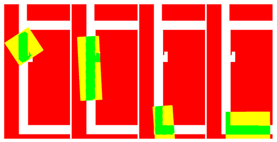 Example of the APM performance. A single grid is placed and rotated with respect to the map and the position estimation certainty. White color denotes accessible areas. Green points in the grid have positive belief values. Yellow points are placed on inaccessible locations.