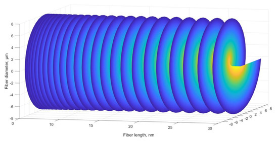 As mentioned above, the OAM signal generation in an optical fiber is currently an underinvestigated and urgent scientific and technical problem. One of the main goals in this field of research is to develop a full fiber-optic passive device that does not require any additional optical components such as polarization controllers (PC) in the case of LPFGs [16], mirrors, lenses, etc. In other words, the proposed device should be a complete fiber optic passive element. In this paper, we propose a method for generating a first-order OAM mode based on ChFBG, which in the general case is a continuous diffractive fiber structure with a spiral (helical) shape. Conventional fiber Bragg gratings, represented by a discrete set of fingers [21], can be defined, for example, using an approach similar to the tunneling effect description in quantum mechanics [22]. However, the most common approach to describe FBGs is the coupled modes theory. The OAM mode generation in this context means the conversion of the fundamental mode into a higher-order mode: in terms of vortex mode generation, it is necessary to achieve the highest possible conversion of the OAM0 mode into OAM1; therefore, the theoretical model of the ChFBG is based on the aforementioned coupled modes theory, considering ChFBG as a type of a mode-coupling device. It is known that the existence of vortex modes requires a few-mode fiber-optic regime since any non-zero order OAM mode is represented by a superposition of the degenerated TE (transverse electric) and TM (transverse magnetic) modes [23]. Thus, since G.652 fiber is multimode in the first spectral window only, the operation in the optical C-band (1530–1565 nm) requires special few-mode fibers, e.g., the step-index FMF by the Optical Fiber Solutions (OFS) company. For the fiber considered, the approximation of a weakly guiding fiber is applicable, i.e., a fiber in which the difference between the refractive indices of the core and the cladding is less than 1% (note that the most commercially available fibers are considered as weakly guiding). In this case, the apparatus of Bessel functions and LP-modes, mentioned in previous section, can be used to describe the mode composition (including OAM modes) of the optical field propagating through the optical fiber [23]. Hence, using the weakly guiding fiber approximation and Bessel-function formalism, the full-fiber OAM-generation problem statement can be formulated as follows: it is necessary to develop a grating that transforms the zero-order OAM mode (with flat wavefront—LP01):