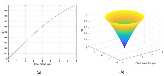 Note that the azimuthal position of the grating finger is defined by . Thus, for linear chirp we can write y(z) = Λ + Λ0z (without chirp—y(z) = Λ); g(z) is the apodization function, used to narrow down the reflection spectrum and change its shape; in our case g(z) is equal to 1 (there is no apodization), f(r) is the radial function, determining the radial refractive index perturbation (because the grating is uniform in the azimuth), since the degree of mode coupling depends on kab according to (5).