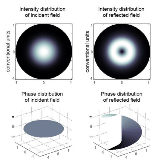 Analyzing Figure 7 we can assert that the vortex structure of the field is formed in the reflected radiation. It can be shown that counter-propagating modes—incident plane wave and reflected OAM wave—are still orthogonal and can be separated. One can separate the reflected field from the incident one, e.g., using a mode splitter [29].