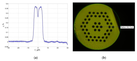 Regarding fibers maintaining vortex propagation, several approaches have been developed. The earliest was based on a fiber proposed by Ramachandran [14] having a refractive index resembling a coaxial structure. The next approach of the OAM fiber-generation methods was based on the inverse parabolic profile of refractive index [15]. The reverse parabolic reverse grading index (IPGIF) fiber has been proposed for robust transmission of cylindrical vector modes as well as integer OAM carrying modes. Large isolation of an efficient index between vector modes in the mode group LP11 {TE01, HE21, TM01} (>2.1 × 10−4) is numerically and experimentally confirmed in this fiber in the whole C-band as well as the possibility of OAM transmission of +/−1 orders for distances up to 1.1 km. The authors also provide simple design optimization rules for redefining fiber parameters.
