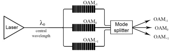 Schematic example of an addressed sensor system based on an array of single-frequency ChFBGs: A coherent optical signal from a laser at a wavelength λ0, which is a central wavelength for all gratings, enters an array of three ChFBGs, which form signals with orbital angular momentums OAM−1, OAM+1 and OAM0. The signals from the sensors can be separated using a mode splitter and directed to further processing (the photodetector is not shown in the figure).