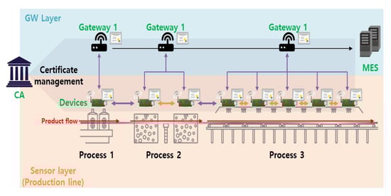 Figure 1 shows a smart factory wherein IoT devices monitor and control the production equipment [6]. Authentication and key negotiation are required to deliver information quickly and securely. Similarly, when data are sent to the manufacturing execution system (MES), authentication and key agreement must be performed by end-to-end communication via a gateway (GW). However, existing public key infrastructure (PKI)-based authentication is too slow in real-time environments.
