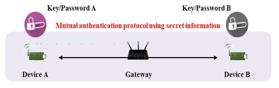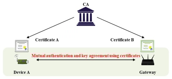 The IoT requires efficient and secure key management. Many objects are interconnected, and AKA is required for secure communication [7]. Key management protocols are divided into key distributions and key agreements (or key exchanges). During key distribution, a sender requesting communication generates a session key, and a receiver decrypts that key. Key agreement calculates a session key via the exchange of random values; the key is not transmitted directly. In general, the IoT uses key agreement because the risk of secret key exposure falls when sessional keys are generated via communication between two objects. However, additional authentication processes are required; most basic Diffie–Hellman key agreement schemes are vulnerable to man-in-the-middle and masquerade attacks [8], because the key agreement protocol per se does not feature authentication of mutual objects. Thus, an authentication process is added, and key agreement is performed sequentially. In the IoT environment, it must be confirmed that two communicating objects are legitimate users or devices; this is termed authentication. As shown in Figure 2, a mutual authentication protocol using secret information generally requires an intermediary (e.g., a gateway) that manages secret information and assists with authentication; this is termed three-party key exchange [9,10]. Another scheme features mutual authentication via a certificate issued by a certificate authority (CA), as shown Figure 3 [11]. The advantage is that two objects can communicate directly; there is no gateway. If authentication is lacking, it is possible that an attacker can participate in communication. After authentication, a session key is required to transmit/receive secure data. The session key is securely distributed to users/objects authenticated via the AKA protocol. In recent years, studies on performing mutual authentication using blockchain in authentication and key agreement have also been conducted [12,13].