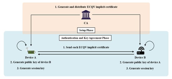 In the setup phase, the devices participating in the IoT are registered in the CA. An ECQV implicit certificate is issued via registration. Thereafter, in the AKA phase, entities with implicit certificates can authenticate and negotiate keys without the intervention of the CA. Below, A sets up the issue of an implicit certificate .