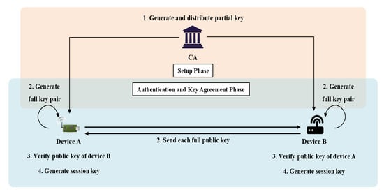 In the setup phase, the CA generates the initial parameters employing the Setup (k) algorithm that uses the security parameter k. The CA then obtains a master secret key s and generates a master public key . The CA then creates public parameters and registers devices that request registration. The devices create individual public and private key pairs using the UserKeyGeneration (params, ) algorithm and send their identifiers and public keys to the CA for registration. The CA signs off on device requests via the ExtractPartialKey (params, s, ) algorithm and generates and returns partial secret keys (the values). Each device receiving a partial secret key generates a static private/public key pair using the SetPrivateKey (params, and SetPublicKey (params, ) algorithms.