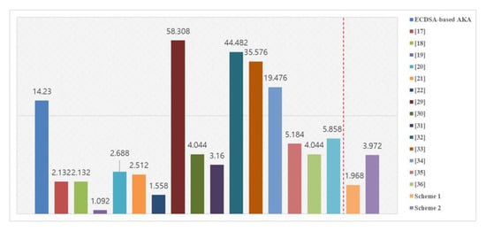 In Scheme 1, we reduced the number of communication times compared with the existing [17,18,19,20,21,22] scheme, which enabled us to speed up the process of authentication and key agreement. Figure 7 compares the times required for AKA by the ECDSA with existing schemes and our schemes (which are faster). The proposed scheme using ECQV is faster than using general ECDSA, and the speed of the proposed scheme is slightly faster. Table 3 shows the comparison of Scheme 1 with the existing schemes.