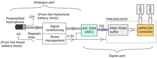 A dedicated electronic board was designed whose functions include, among others, adding a second microSD card to double the available storage capacity. This electronic design (called signal conditioning in Figure 1) isolates the analog audio signal captured by the hydrophone (including its amplified components) from the digital signals and power supply of the peripherals and processor by adding two independent grounds, reducing the interferences from the processor’s electronics on the low-level hydrophone signal, and increasing the signal-to-noise ratio.