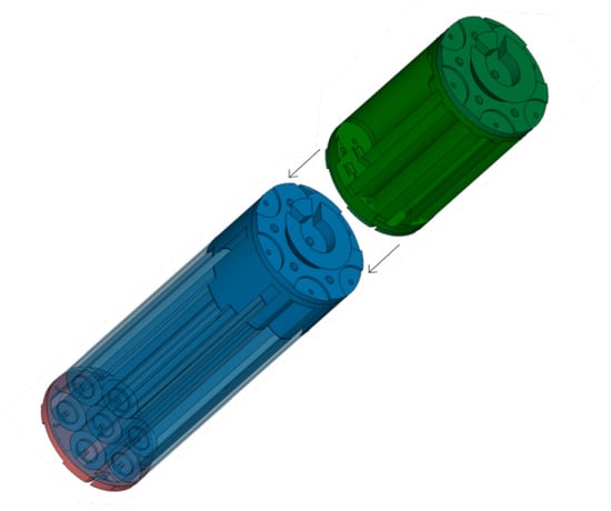 Moreover, to maximize the energy density in the cylindrical housing, a hexagonal layout of D-cell batteries was created. The battery block to supply power to the electronic components is composed of 7 × 4 D-type batteries (see blue block in Figure 3). It should be noted that it was decided to use a voltage of 6 V instead of 4.5 V to take advantage of the length of the aluminum housing. Also, a shorter battery pack was designed with 8 D-type batteries placed in serial connection to provide 12 V to the C57 pre-amplified hydrophone (see green block in Figure 3). This hydrophone can be amplified in a range from 7.5 V to 30 V. We chose 12 V since this is a value that is maintained for deployments of 4 months.