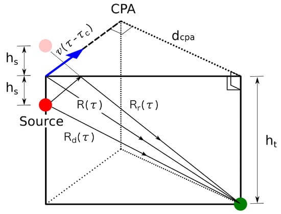where , c is the sound speed in water, and is the time when the target is at the CPA. The frequency shift due to the Doppler effect can also obtained as in [16]. For a ship with an engine resonance at , the Equation (A10) can be used to predict the frequency shift (see again Appendix A).