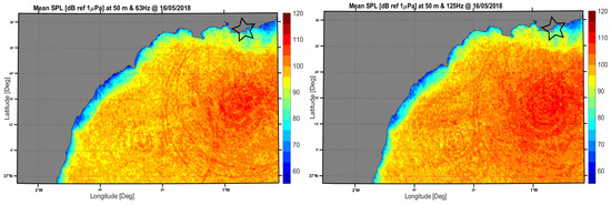 The results obtained considering ray theory approximation are summarized in the sound maps of daily SPL dB re 1 uPa at a depth of 50 m. Figure 7 shows the daily sound map of the region studied after computing AIS data in the propagation model at frequencies of 63 Hz and 125 Hz on the day 16 May 2018. In addition, it is important to remark that both sound maps were calculated at a depth of 50 m, which is the depth where the SAMARUC device was installed (marked with a black star).