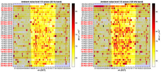 In addition to the aforementioned results, the computed 1/3 octave indicators can be conveniently structured in hours and days, and represented as a 2D color map to provide an acoustic panorama and identify seasonal events [19]. This representation technique is convenient when large temporal series need to be represented, as often happens with 1/3 octave ambient noise indicators. Figure 8 shows one of these representations for El Gorguel (Cartagena), where a repetitive acoustic event starting on 1 November 2018 at approximately 22:30 h can be detected. It also shows, as one might expect, higher ship noise levels in the 125 Hz band during the day than during the night.